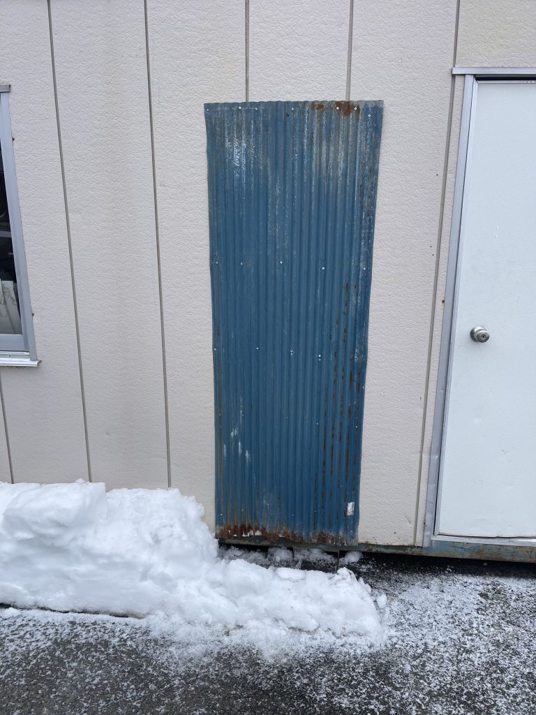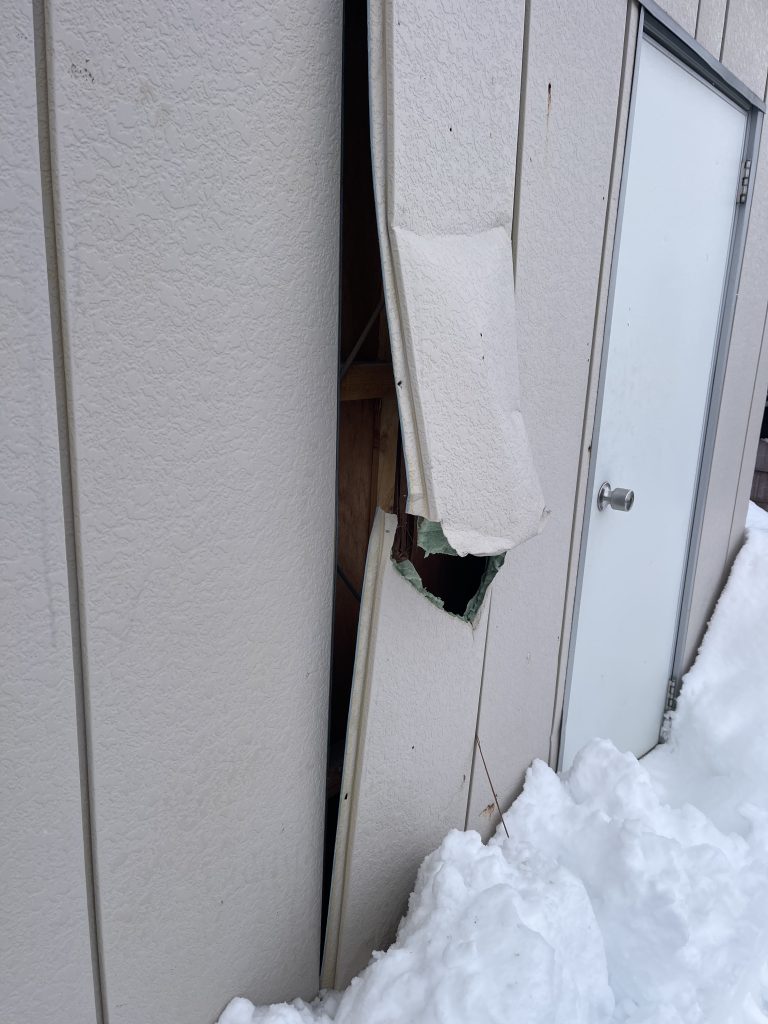 ↑雪を寄せすぎて自分のプレハブを破損させてしまいました。雪かきも加減が大事ですね……。